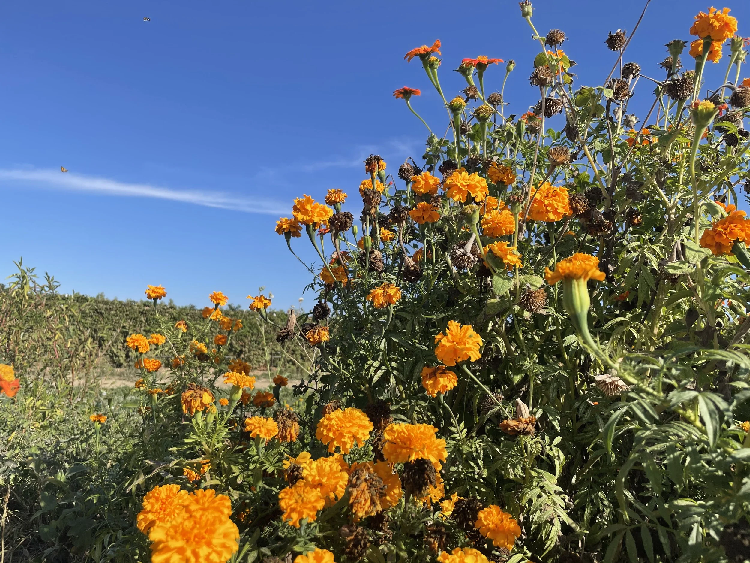 Marigold or Cempasúchil flower is meaningful to many cultures around the world and many farmers here in California. The marigold is a natural fumigant and pest deterrent and it is frequently planted as a part of insectary gardens and integrated pest management. A Hmong ceremony called Baci involving the realignment of the body places a pile of marigolds at the center of the offering. Día de los Muertos, The Day of the Dead, uses marigolds to communicate with the spirits; they are considered the emissaries between the living and the passed. They are also used in huge abundance in the South Asian Diwali festival where they are used to create an art form called rangolis. The flowers are native to the Americas and were carried across the world, just to come back to be planted in the California countryside by farmers of color.
